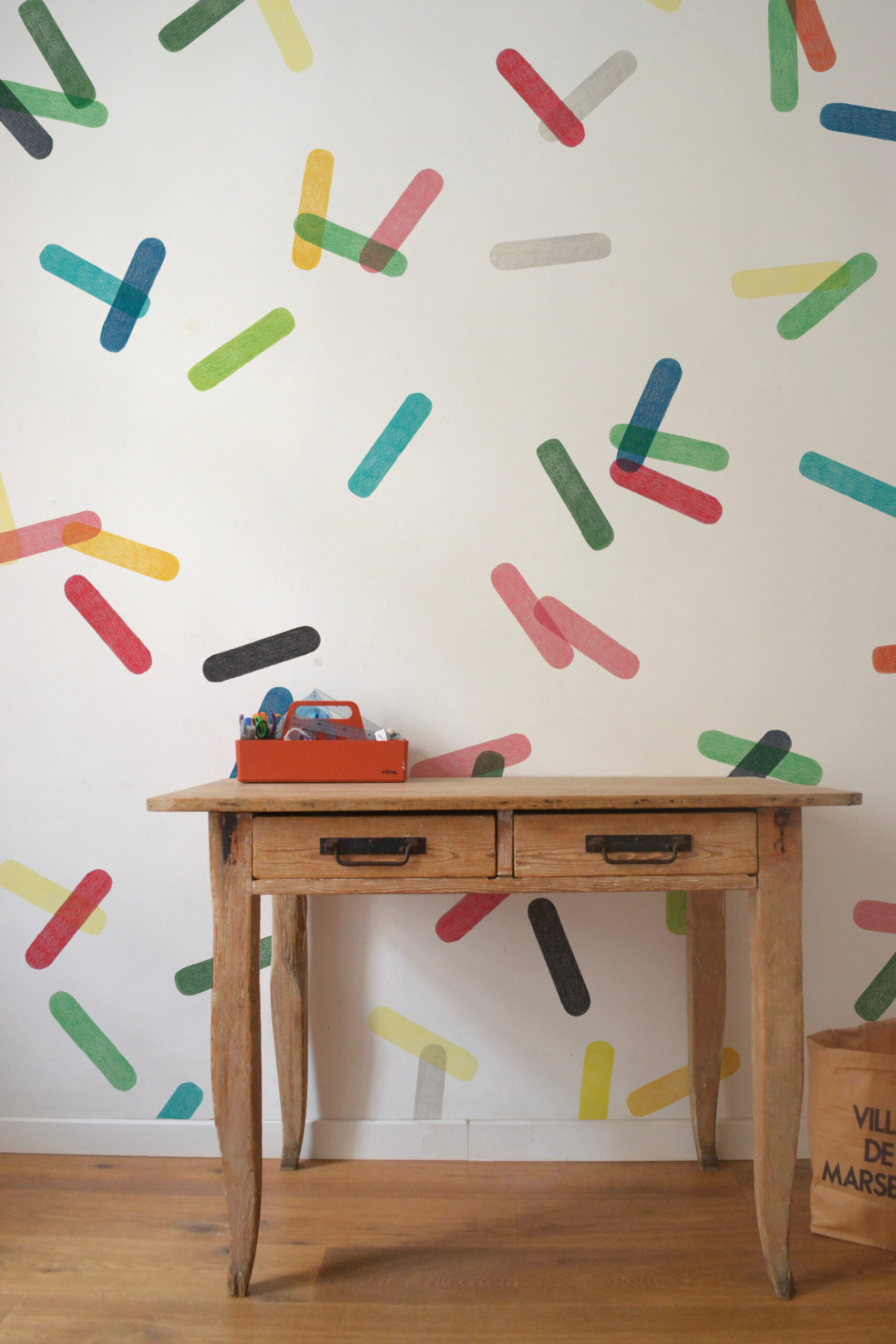 Dans un esprit pop résolument assumé, Confettis jongle avec texture et couleurs superposées. A la fois graphique et velouté, ce motif entièrement réalisé au crayon de couleur fait le pont entre authenticité et modernité.